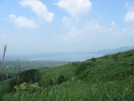 少し行くととってもいい景色になりました。山中湖が見えます。今日は雲があって富士山は見えませんでした。