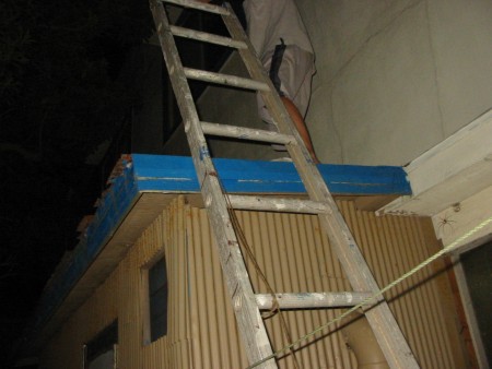 夜には2階の客室のエアコンが故障しました。室外機がオーバーヒートしたそうです。凧さんは1階の屋根にはしごで登って様子を見ています。
