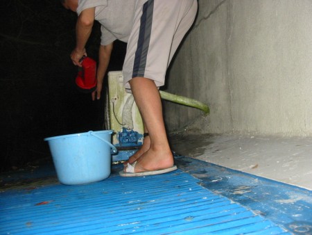 とりあえず今夜一晩だけでも直ればいいので、岳さんが汲んできたバケツの水を室外機にかけて冷やしていました。