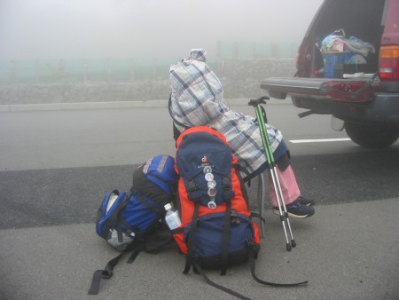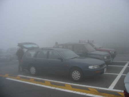 霧がすごいので、CAJUさんたちがトイレに行くのに岳さんがガイドをしていました。ここは駐車場が広いので、適当に歩いてトイレに行ったら遭難しちゃいそうです。
