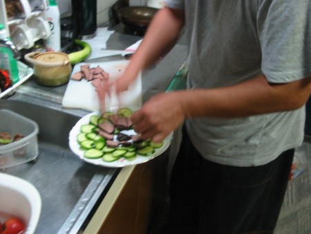 男の人みんなで食事を準備します。CAJUさんはスモークレバーをスライスしてお皿に並べています。