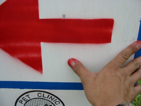 岳さんは○夫さんと一緒に、案内の看板に赤いスプレーのペンキで矢印を書きました。