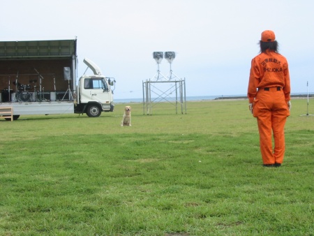 このイベントはワンちゃんのイベントが主になるみたいです。災害救助犬のデモンストレーションがありました。雨もやんで、いい感じになってきました。