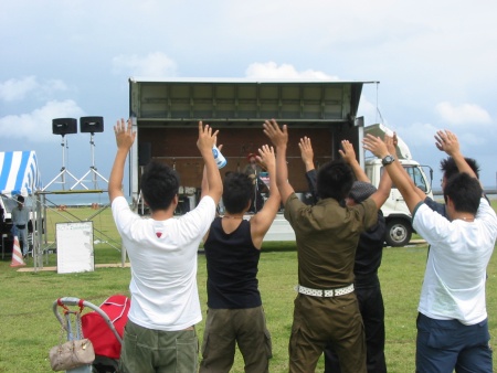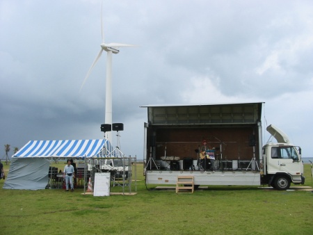 屋外ライブのステージはウイングタイプの4トントラックです。誰かが、お友達の会社から借りてきたそうです。すごい人たちですね。